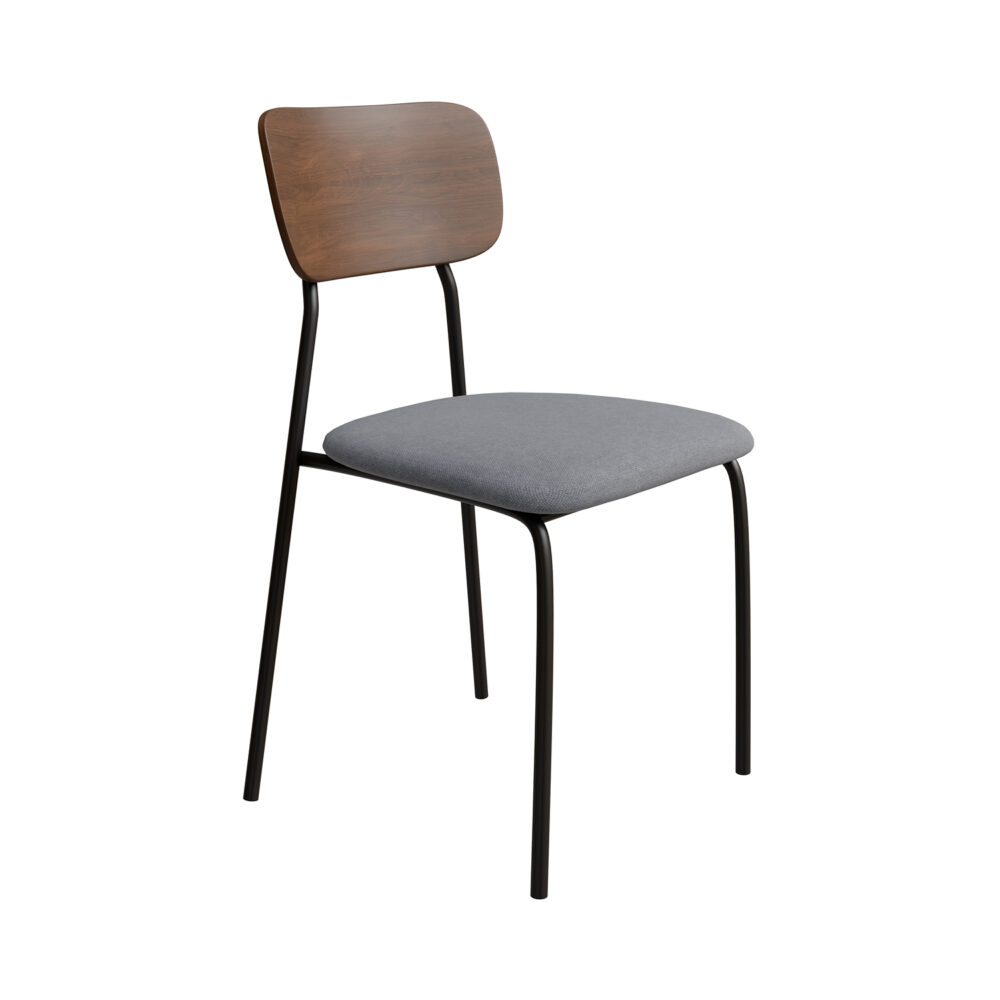כיסאות פינת אוכל בעיצוב מודרני תעשייתי גב עץ בגוון אגוז מודרני מושב מרופד ונעים לישיבה ורגלי מתכת שמעניקות מראה קליל ומאוורר – מושלם גם לחללים קטנים וגם לפינות אוכל פתוחות לסלון