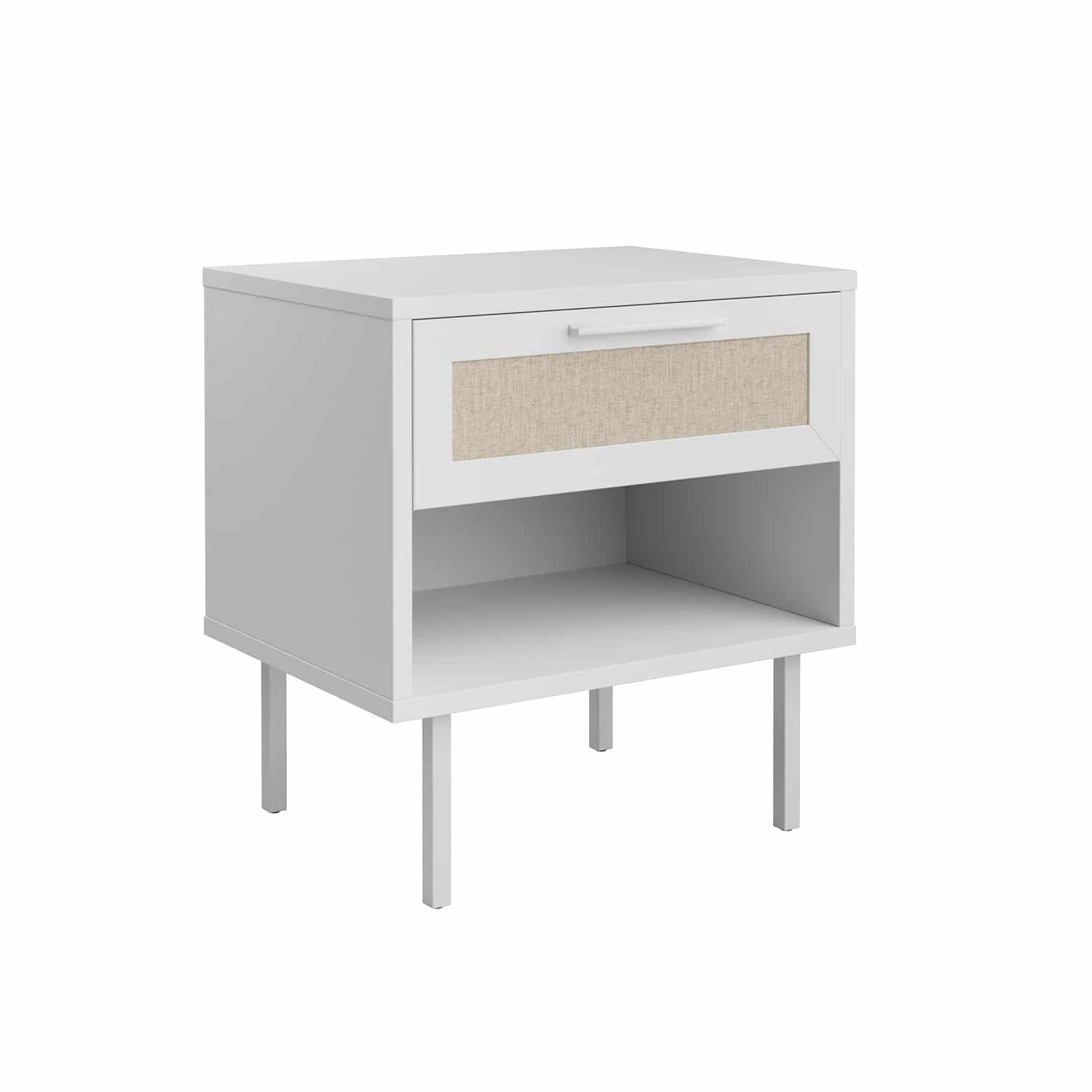 השידות מכילות מגירה רחבה עם דוגמא בסגנון ראטן ותא פתוח שימושי לאחסון נגיש