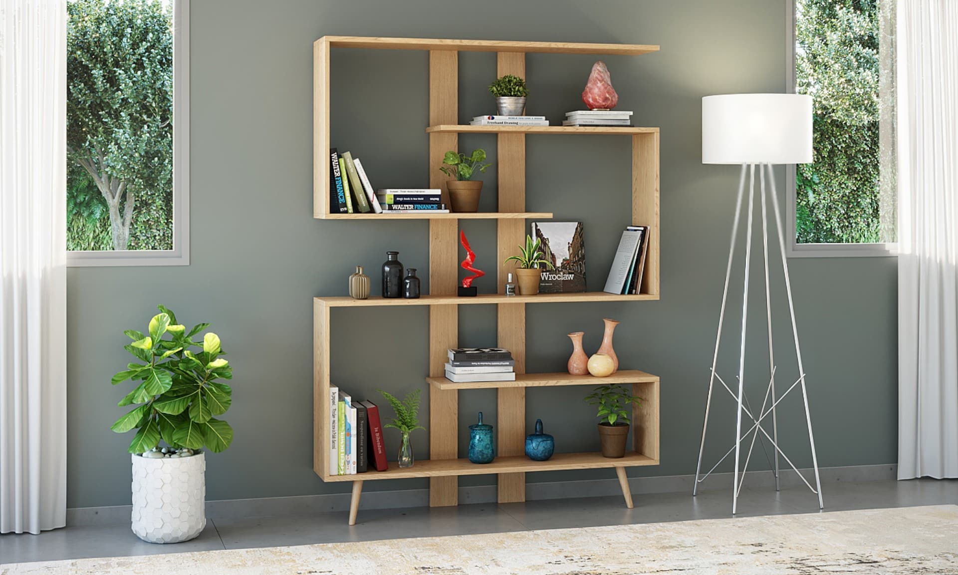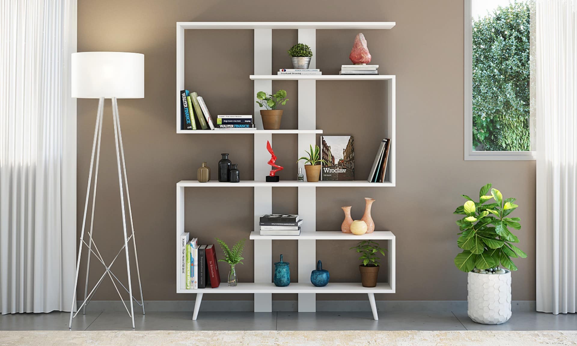 ספרייה רחבה מעוצבת לשימוש בסלון הבית לתצוגה או לחדרי הבית לאחסון