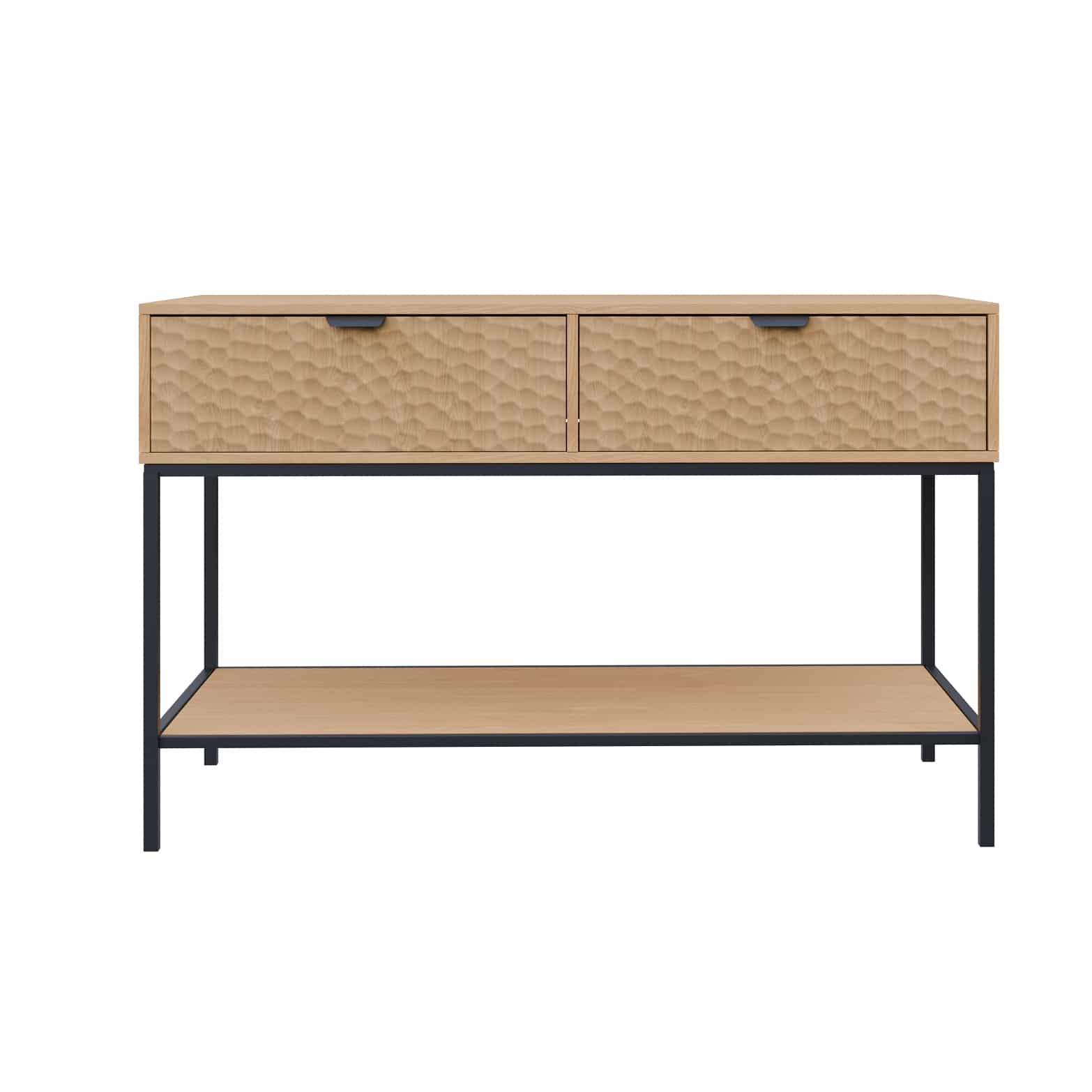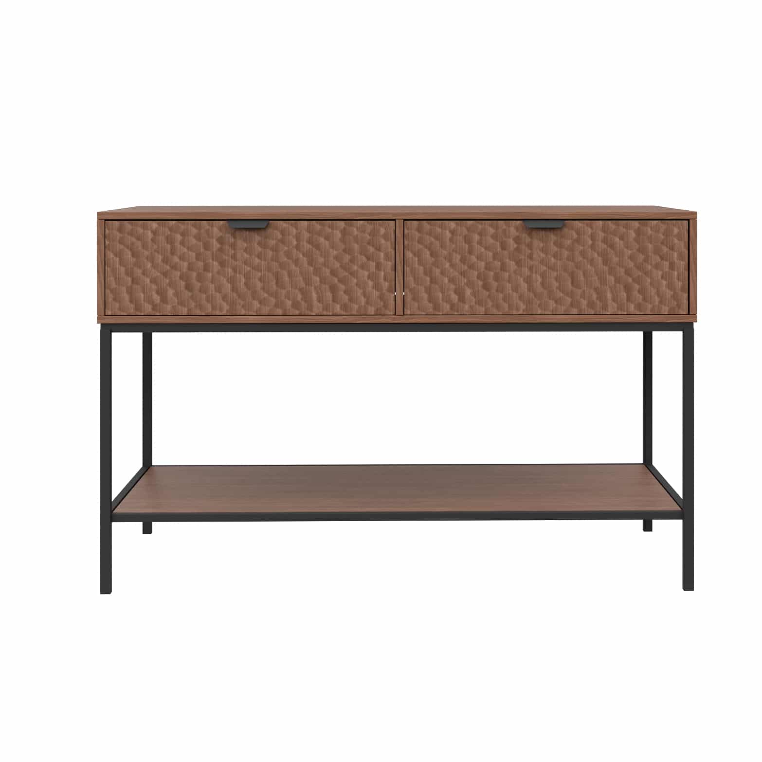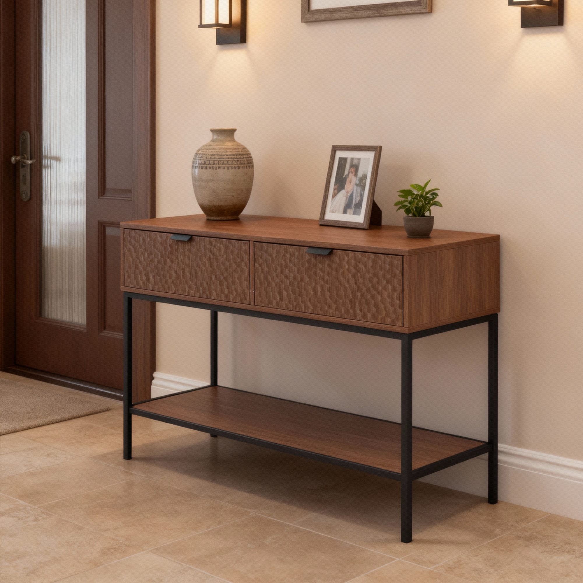 הקונסולה עשויה משבבי עץ דחוסים בשילוב מלמין איכותי בעיצוב תלת מימד ורגלי מתכת חזקות