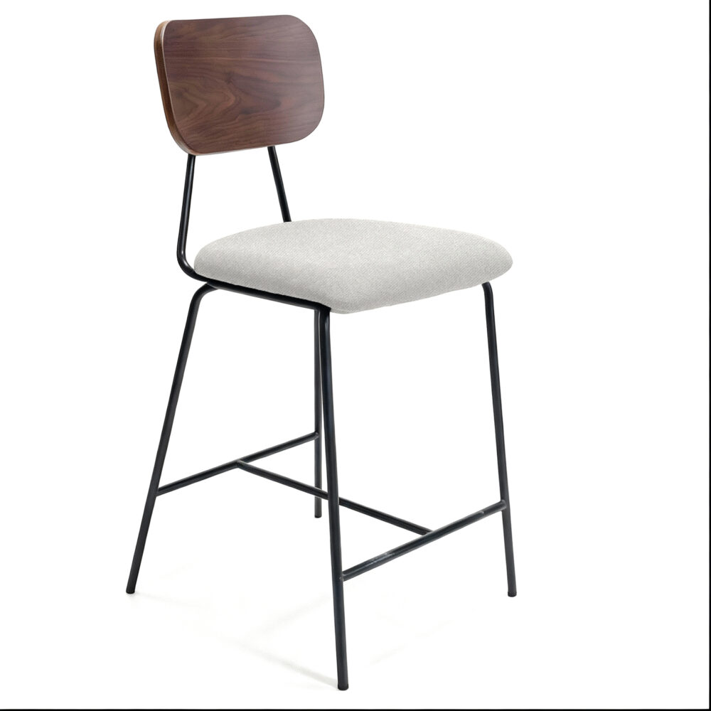 כיסאות בר מעוצבים בסגנון מודרני תעשייתי שמשלב גב עץ חמים מושב מרופד ונוח במיוחד ורגלי מתכת חזקות מושחרות שמעניקות מראה אלגנטי ומינימליסטי