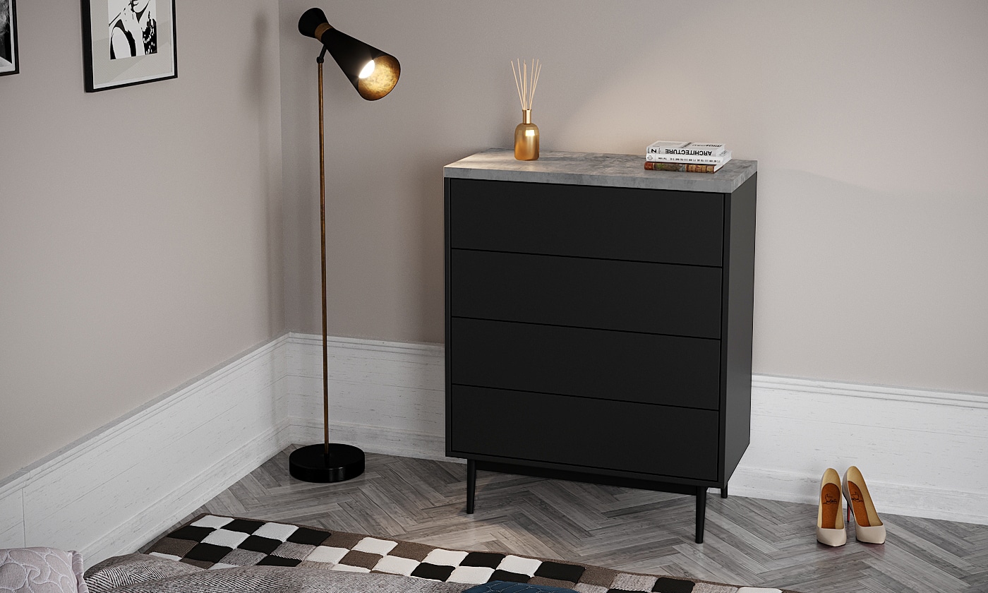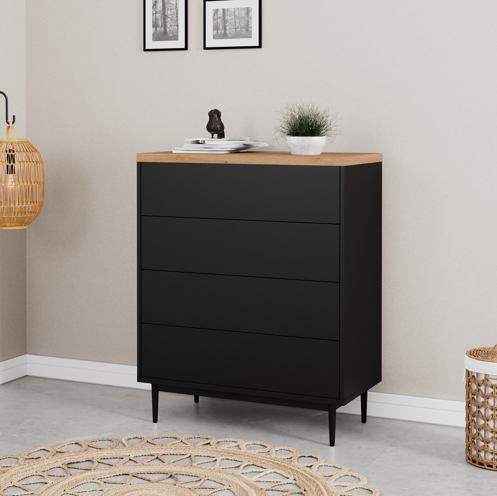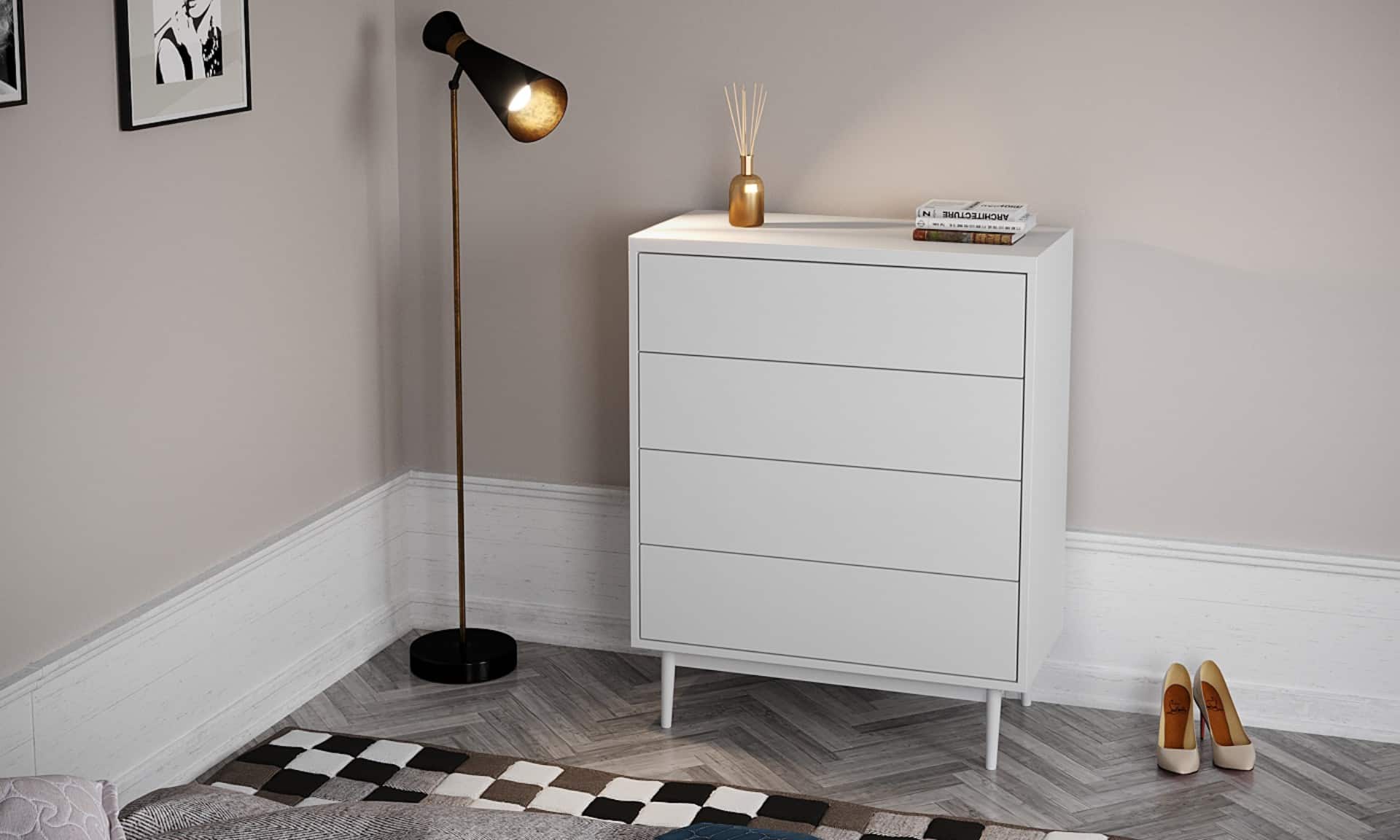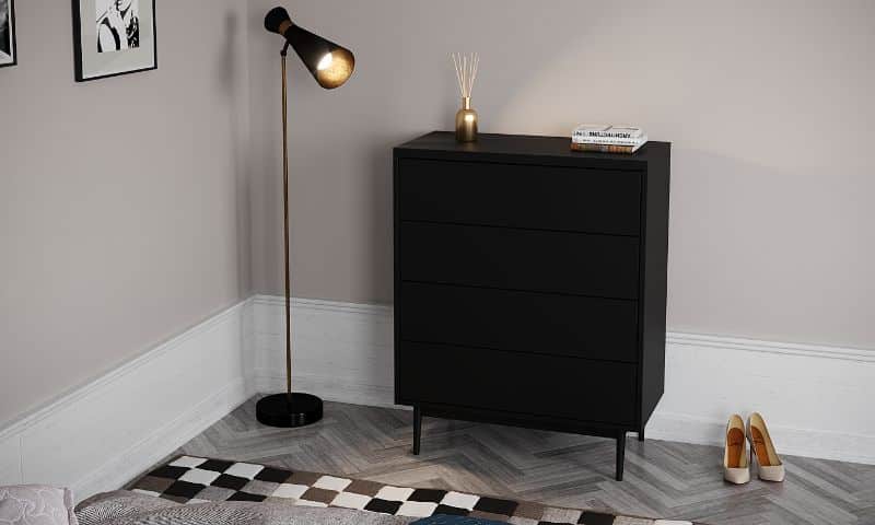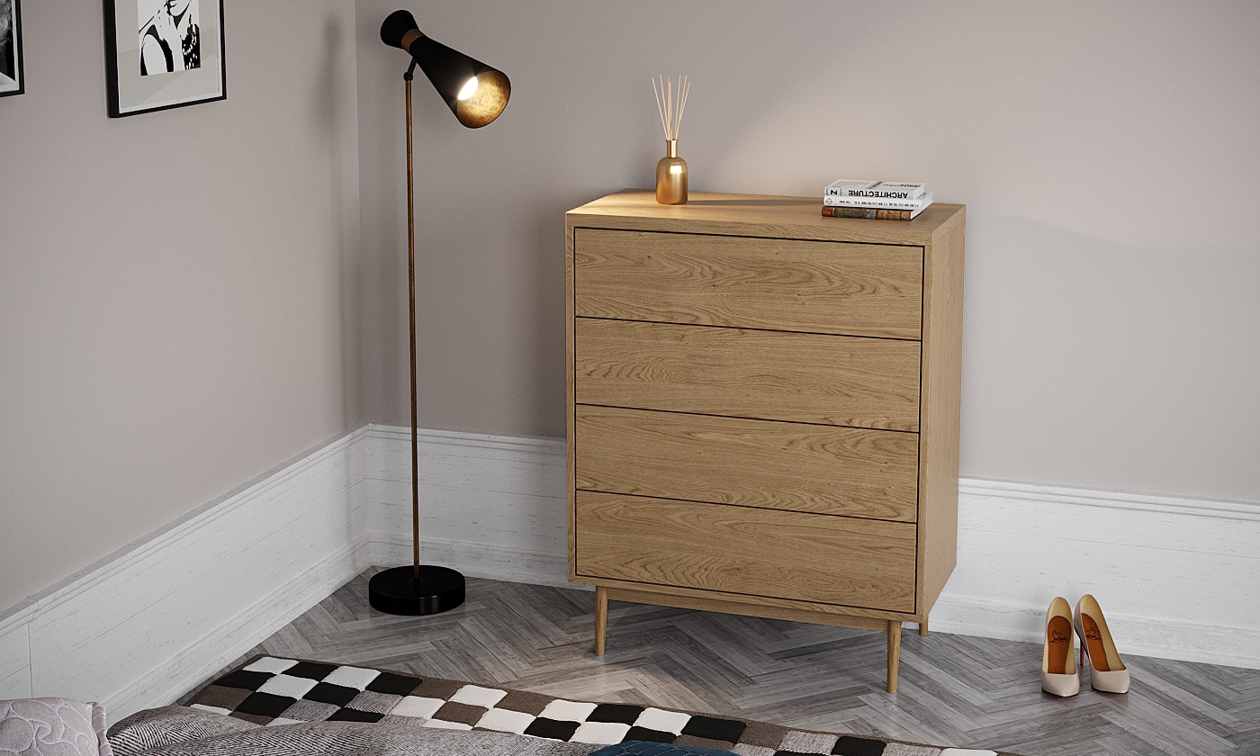 ארבע מגירות הנעות על מסילות נוחות ושקטות לפתיחה וסגירה נוחות העומדות על ארבע רגלי עץ חזקות ליציבות מירבית