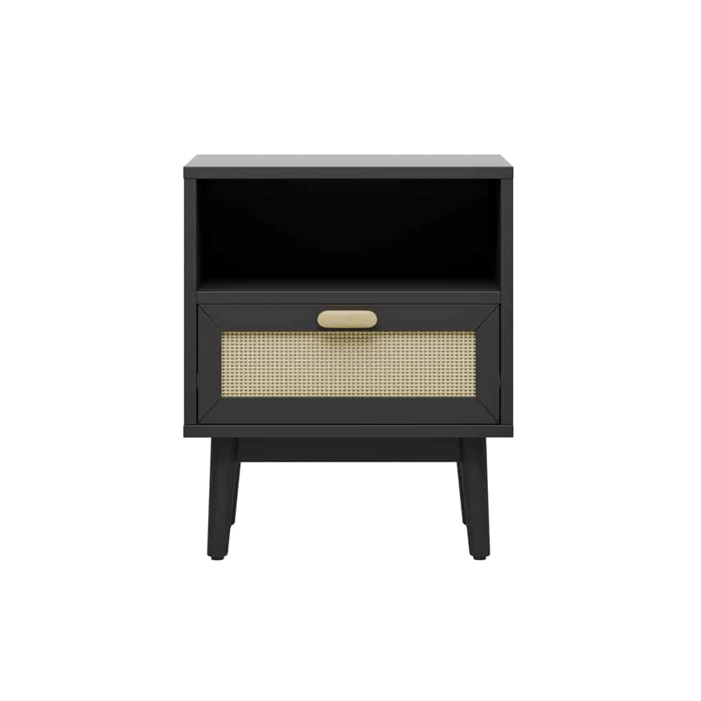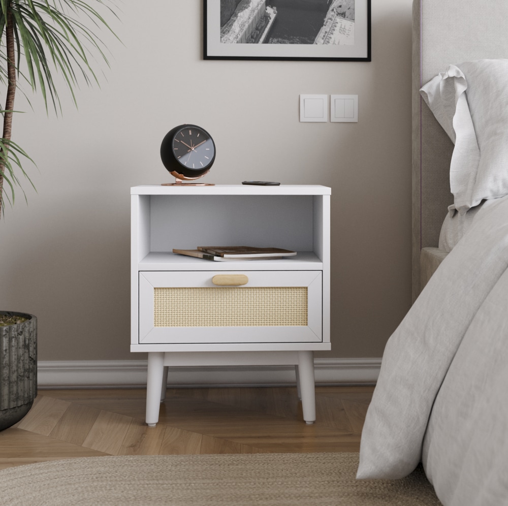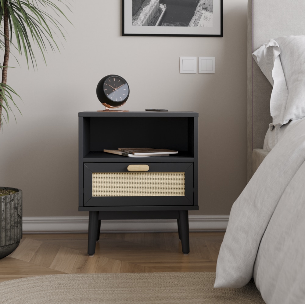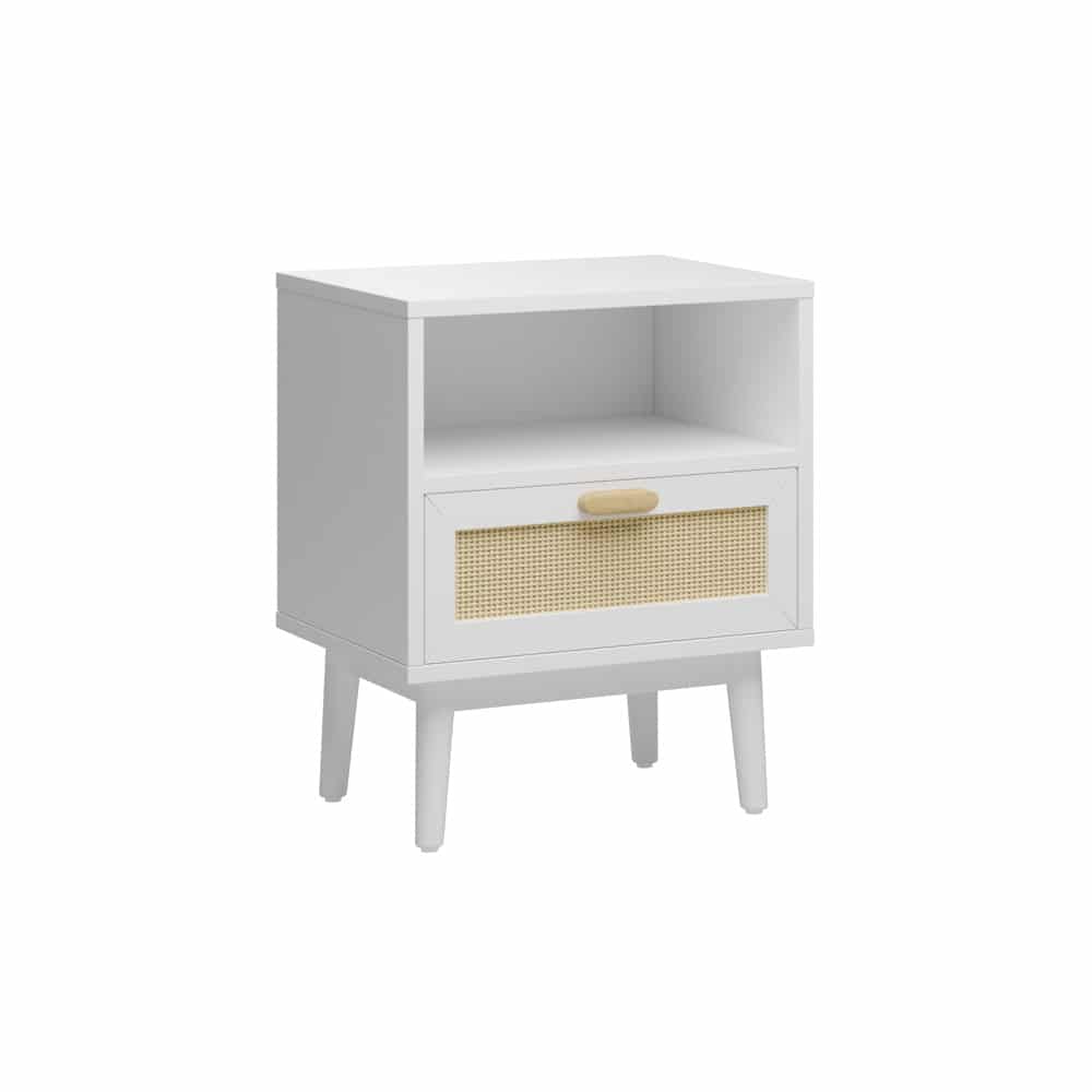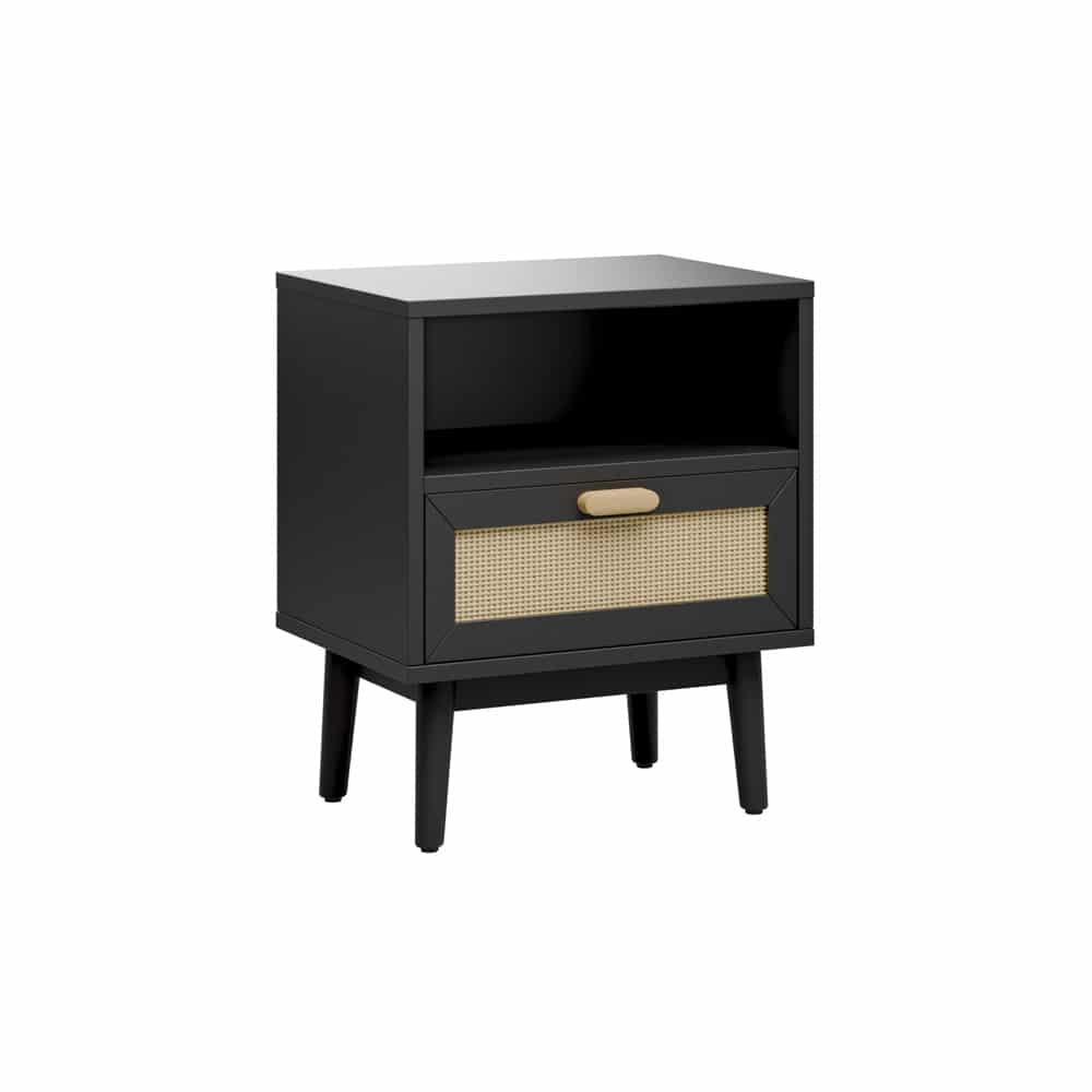 שידת לילה דגם ליידן המשלבת מגירה בגימור דמוי ראטן ומדף בעל חלל אחסון בשלושה צבעים מודרניים לבחירה
