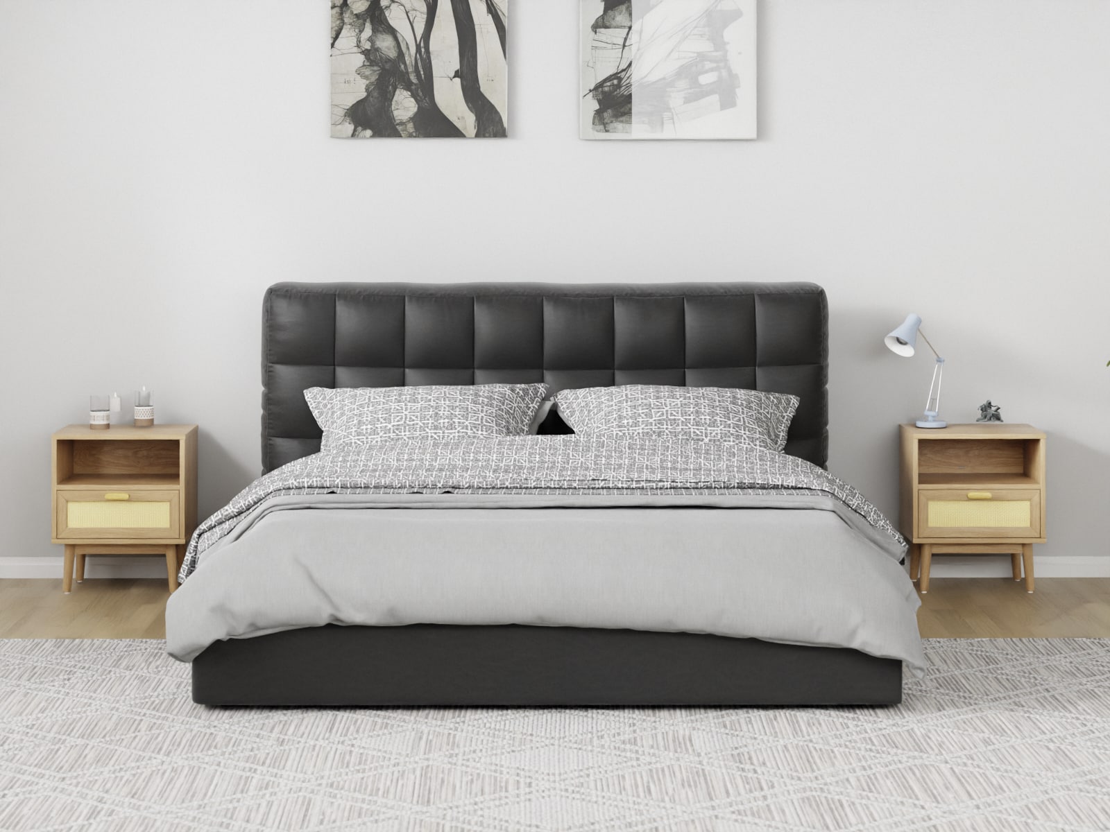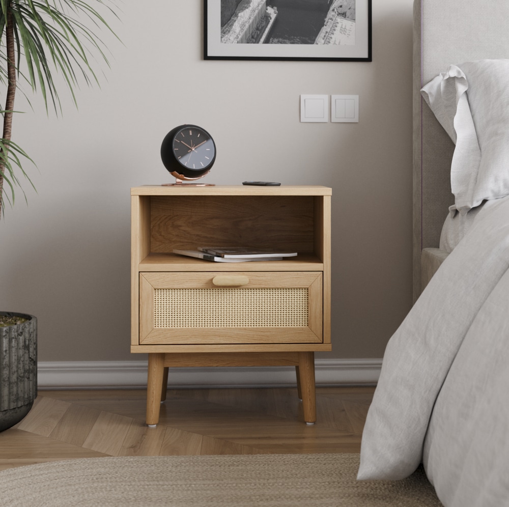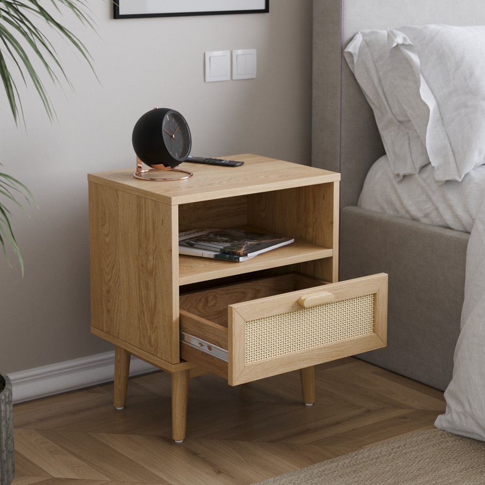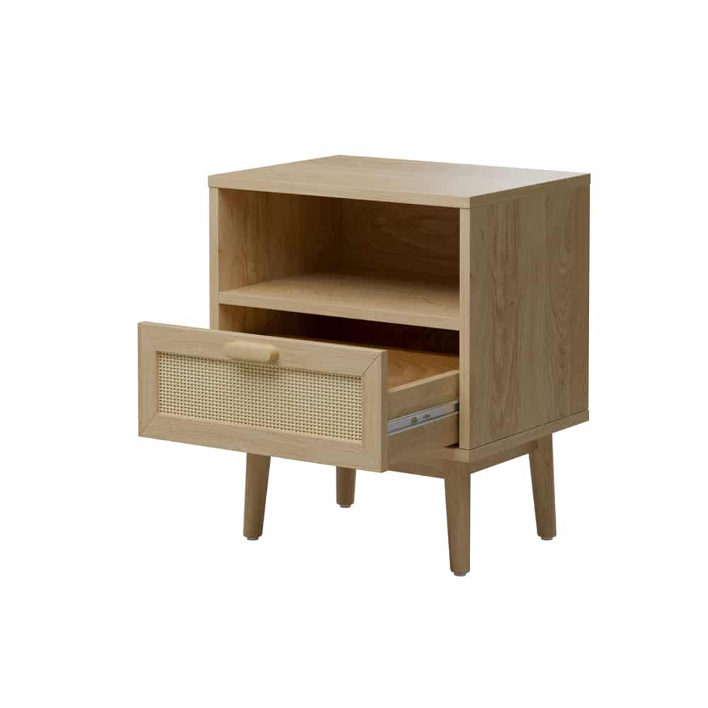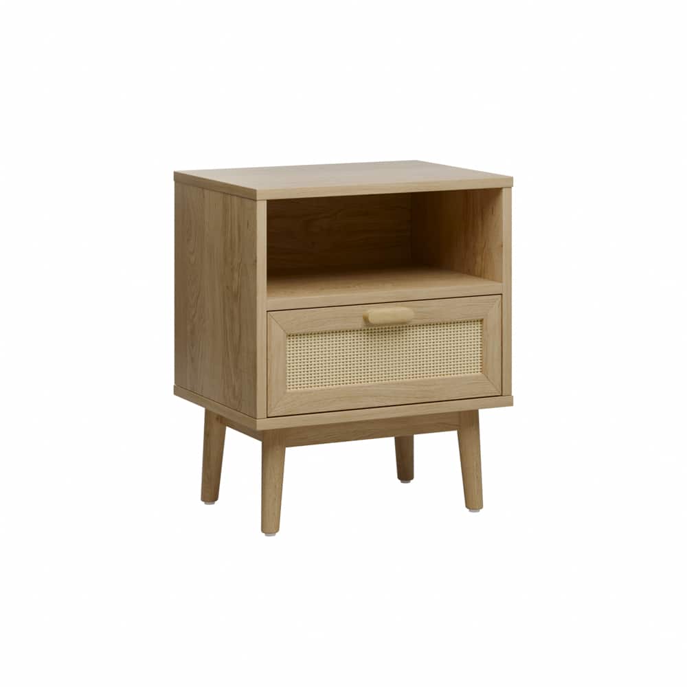 שידת לילה דגם ליידן המשלבת מגירה בגימור דמוי ראטן ומדף בעל חלל אחסון בשלושה צבעים מודרניים לבחירה