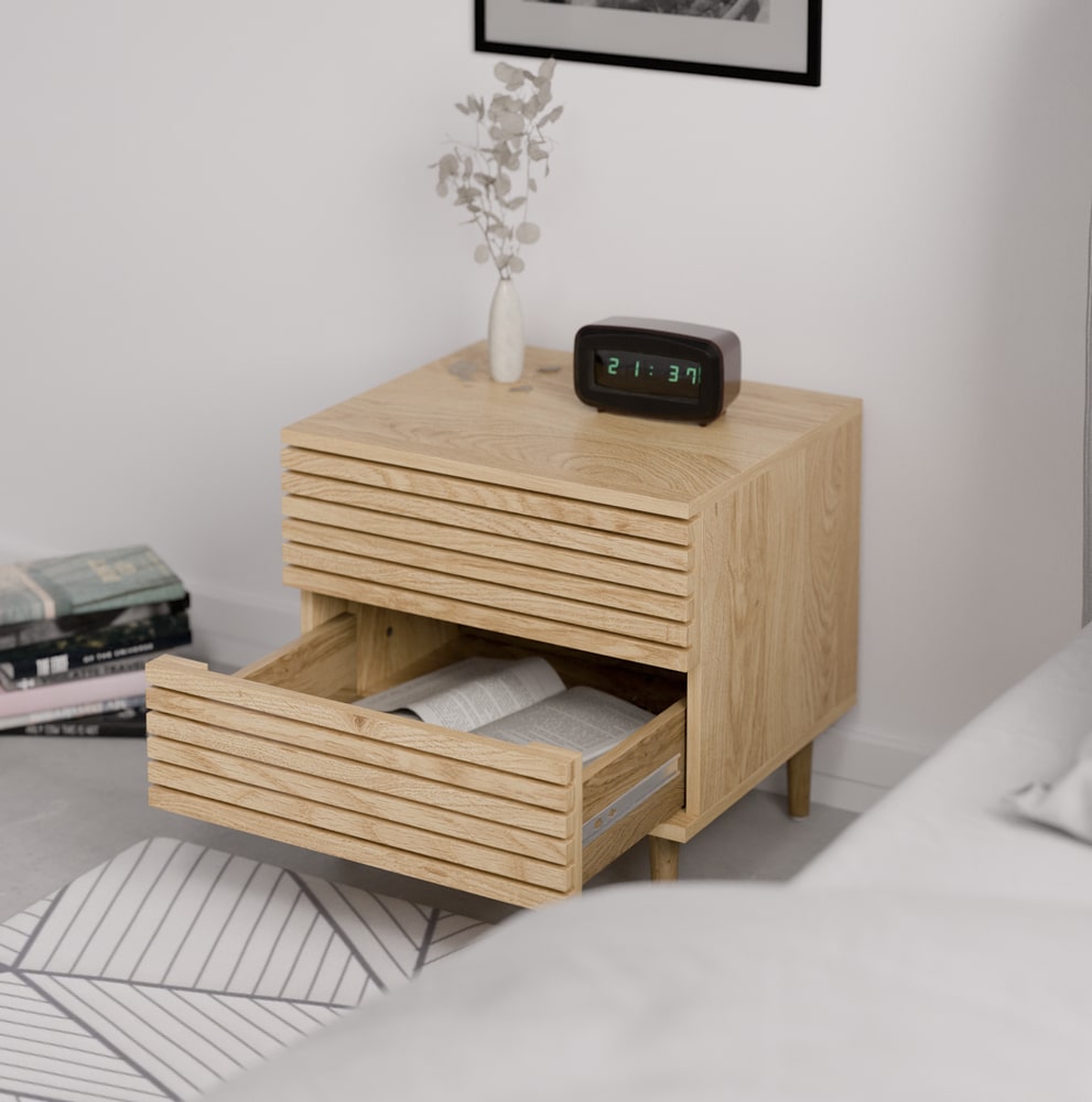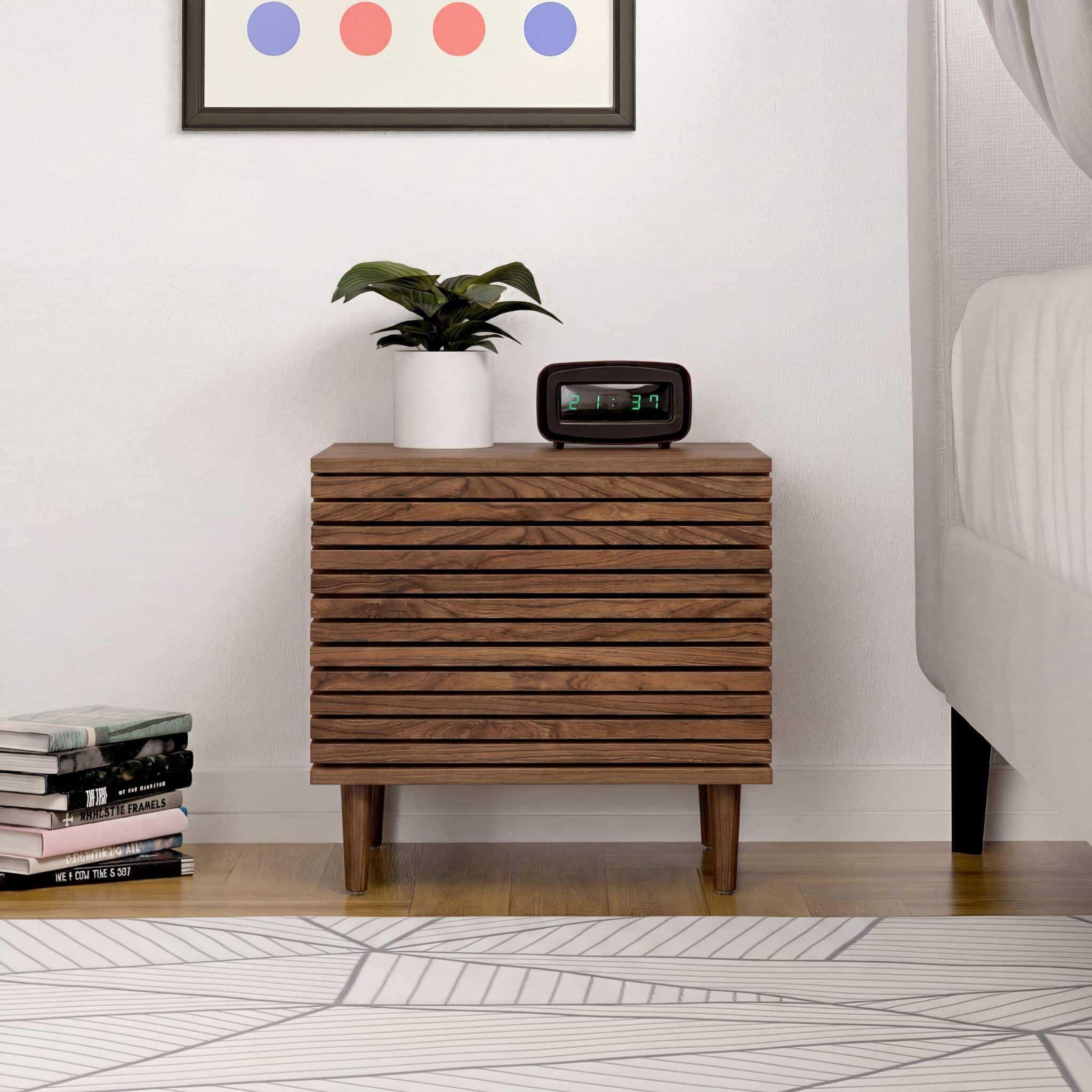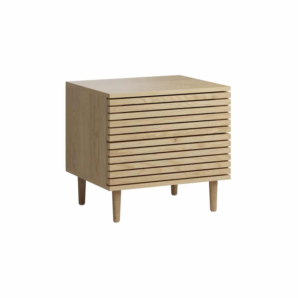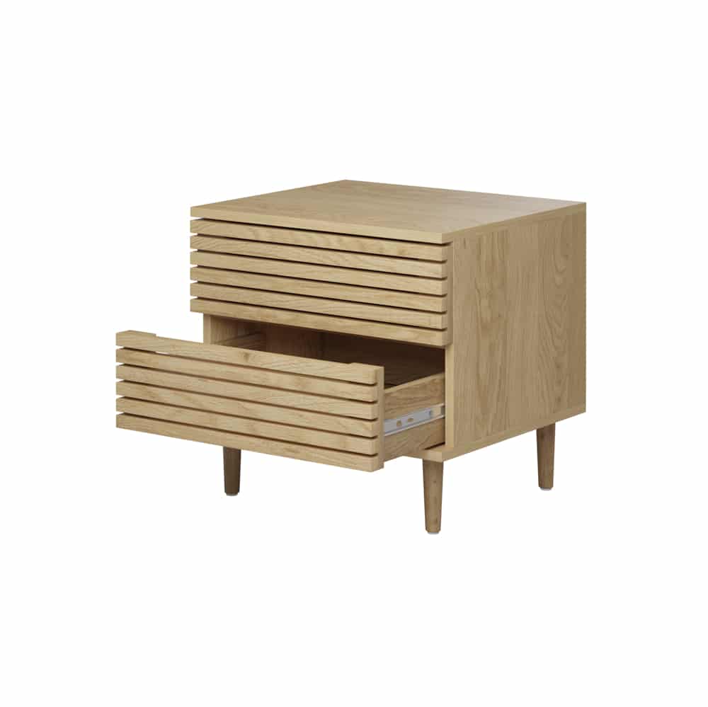 שידת לילה בעלת שתי מגירות ומנגנון פוש נסתר במראה מודרני ומושך